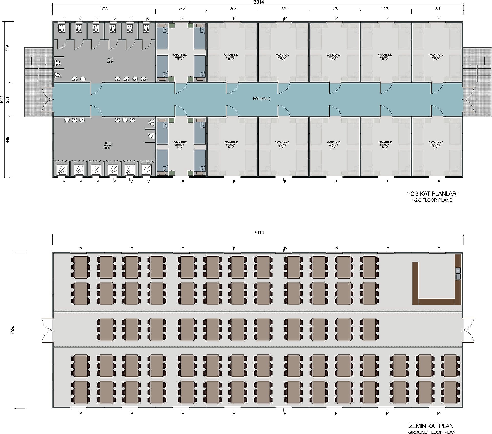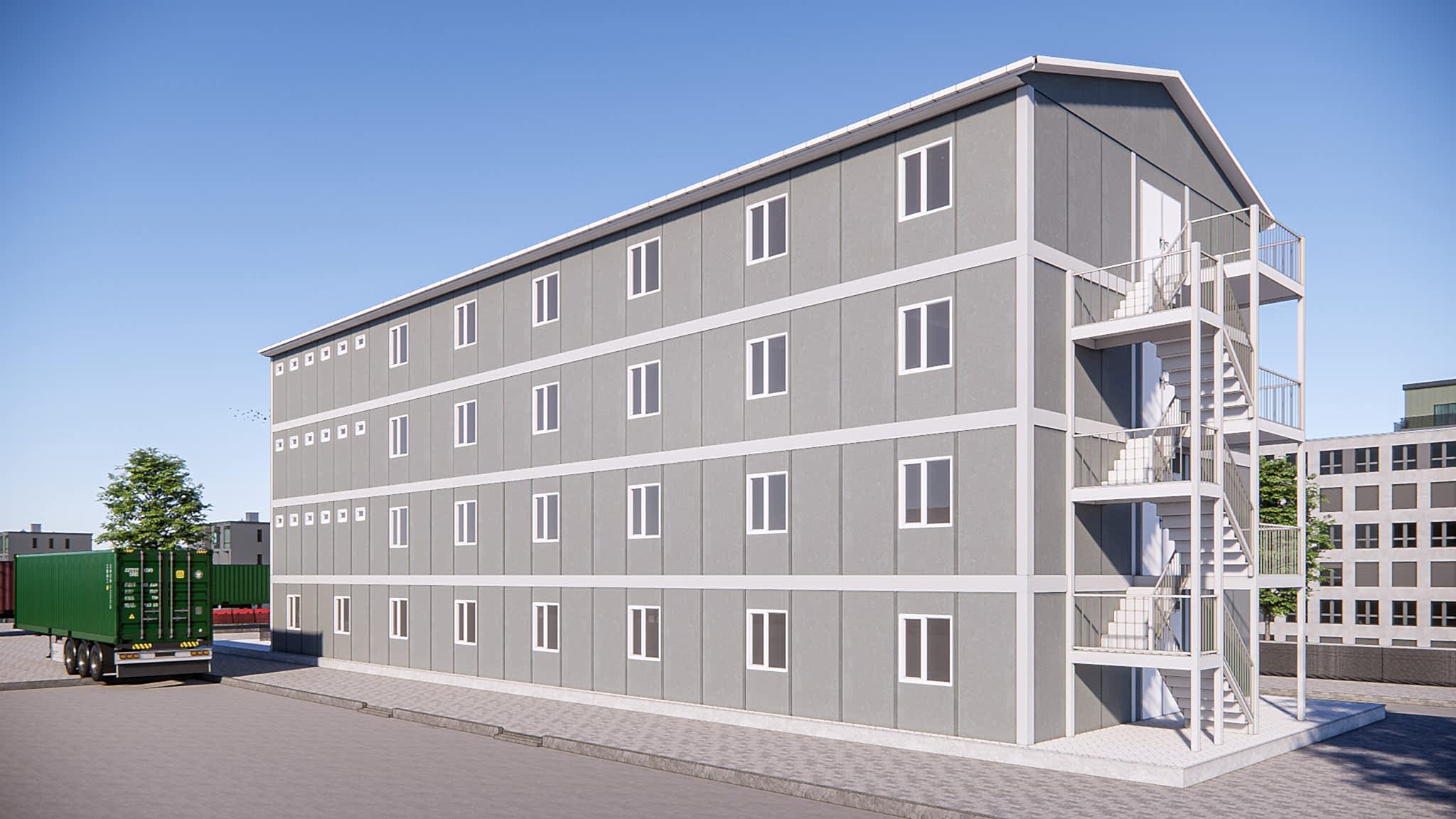 1234 m² dört katlı prefabrik yatakhane, en büyük konaklama ihtiyacına sahip projeler için geliştirilmiş dev bir barınma tesisidir. Dört katlı yapısı sayesinde yüzlerce personelin aynı anda konaklamasını sağlar. Uluslararası büyük projeler, maden sahaları, enerji projeleri ve askeri bölgeler için en yüksek kapasiteye sahip profesyonel çözümüdür.